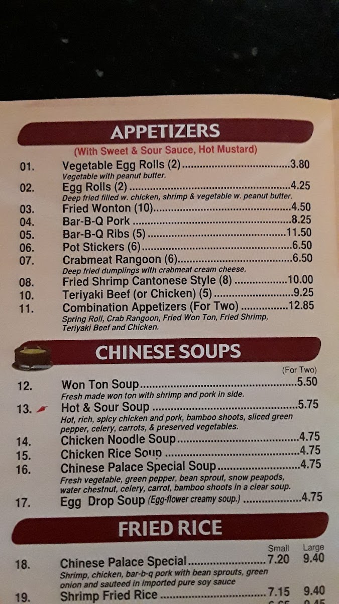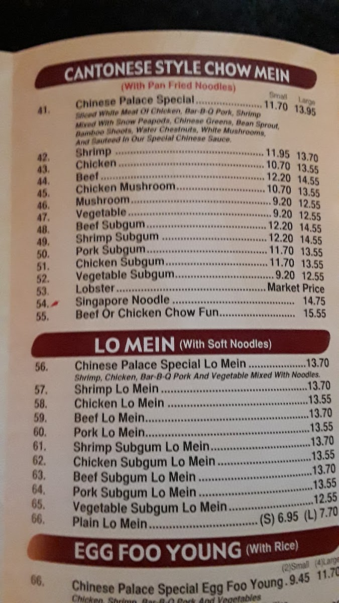 The menu features a variety of traditional Chinese dishes organized into several categories to suit different dining preferences. Starters include Chinese soups such as Chicken Rice Soup and Chicken Noodle Soup, offering lighter options to begin a meal. The Lo Mein section provides noodle dishes like Chicken Subgum Lo Mein and Beef Subgum Lo Mein, suitable for those seeking a carbohydrate-based main.