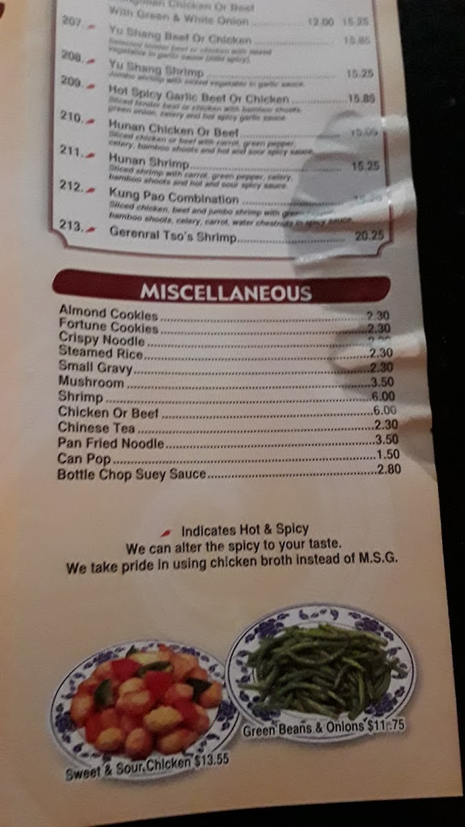 Main course selections are highlighted within the Mandarin and Szechwan dishes category, which includes options like Hunan Shrimp and Kung Pao Combination, both served with a range of vegetables and distinctive spicy sauces. Additional popular items, such as Crab Rangoons, Mongolian Beef Lunch Special, B-B-Q Pork Fried Rice, and Beef Subgum Lo Mein, are available as part of the varied menu offerings.